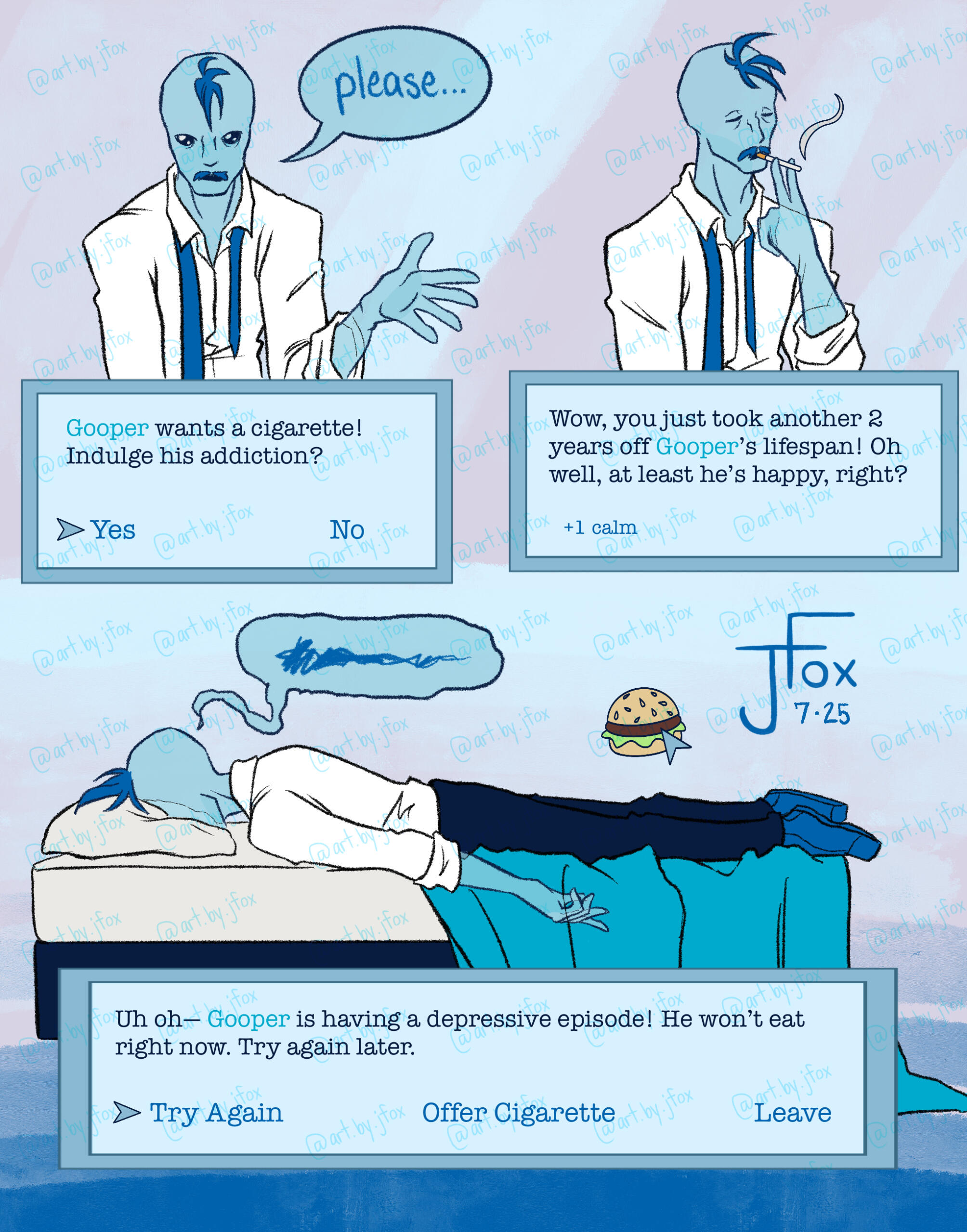This contract applies to Jaden Fox, further called Artist, and the person or institution purchasing a work of art from them, further called Customer. By ordering a commission, the Customer agrees to the following terms and conditions: